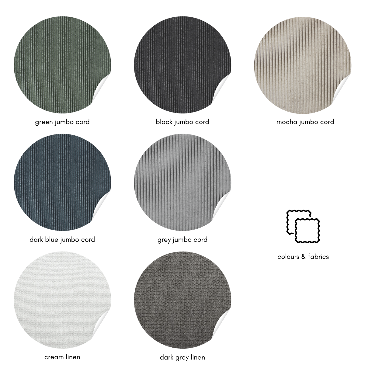 - Available in grey, green, dark blue, mocha or black jumbo cord or cream or dark grey linen fabric