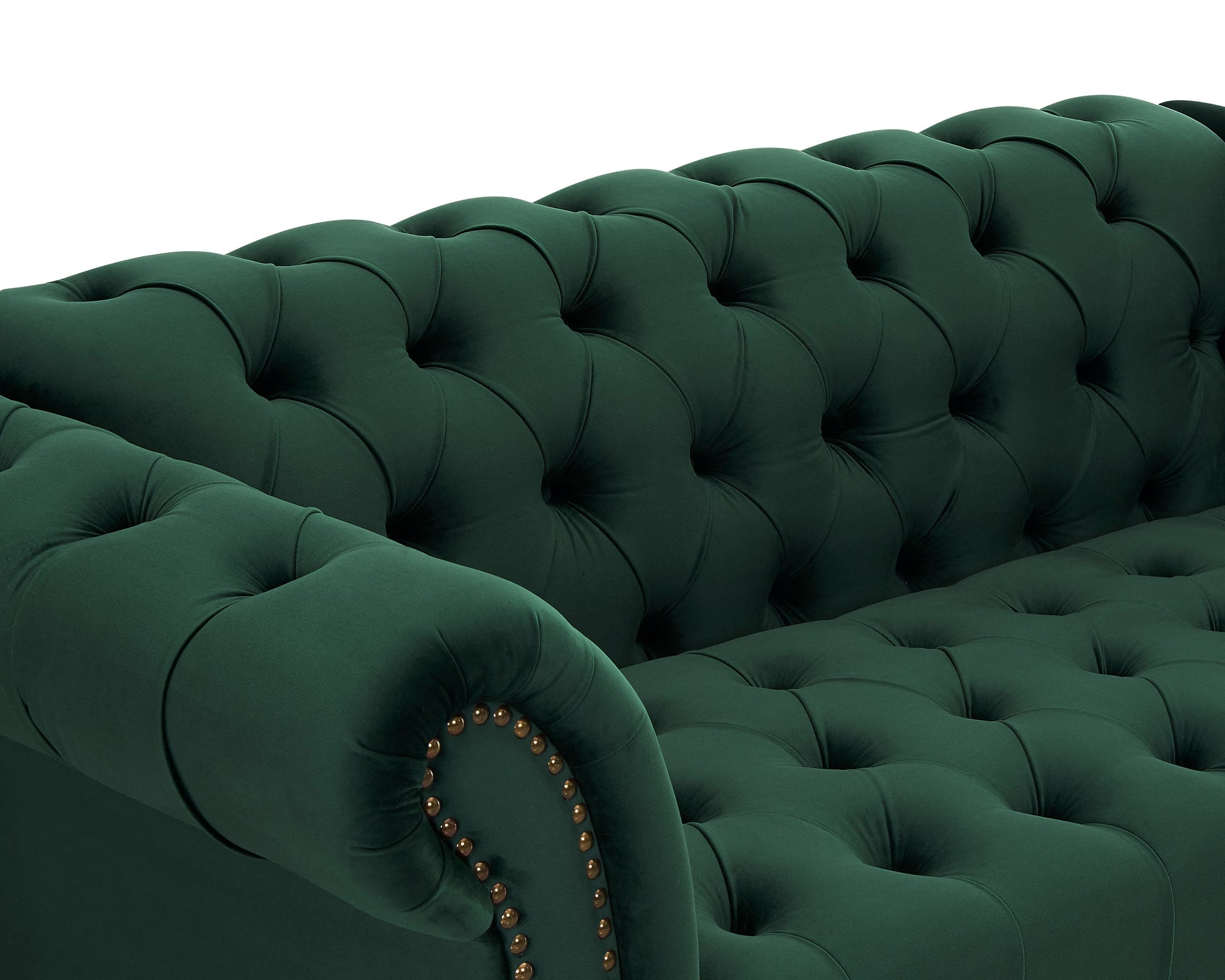 The Emma features a rounded yet boxy shape with a smooth velvet outside and the traditional chesterfield tufted detail on the interior of the seat area. Regardless of the type of sitting you select, the seat cushion is one piece, and the armrests are high with a flared scrolling design and stud detailing along the front of the armrest. The characteristic wooden legs of Emma couches support them.