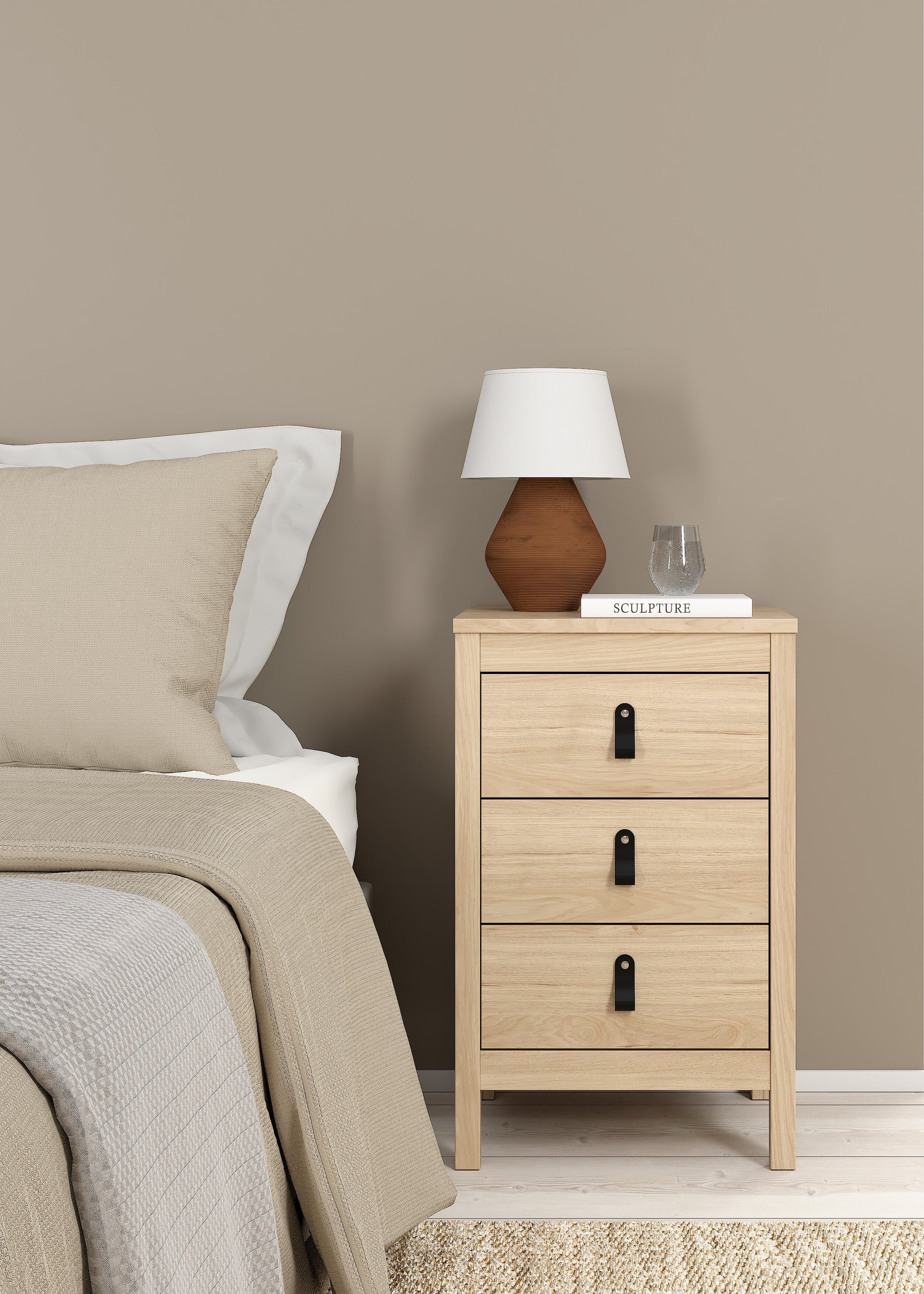 The Madrid Nightstand is tall and perfectly complements high beds with its sleek and contemporary design. It features three drawers for storage, and high legs that make cleaning underneath easy. Madrid Nightstand comes with two handles, a leather strap and a metal handle, both are included and available to see in images
